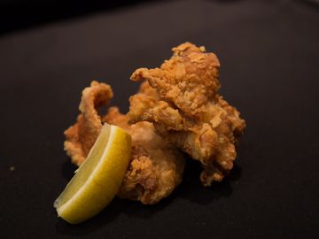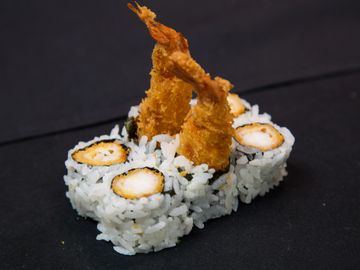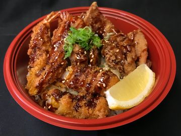 Fried Shrimp, Fried Chicken & sauteed Cabbage on a bed of rice.